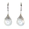 Freshwater pearl and sterling silver drop earring, featuring a 3mm semi-round pearl stud with crown design plus a 7mm oval pearl suspended below. Available in rhodium plated silver or yellow gold finish.