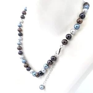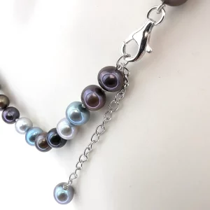 This lovely necklace has been hand-made in our Wiltshire studios and features a mix of bronze, teal, purple and silver coloured 8mm (approx) freshwater pearls. These are strung to 18-inches on a sterling silver lobster claw clasp with a 2-inch silver extension chain.