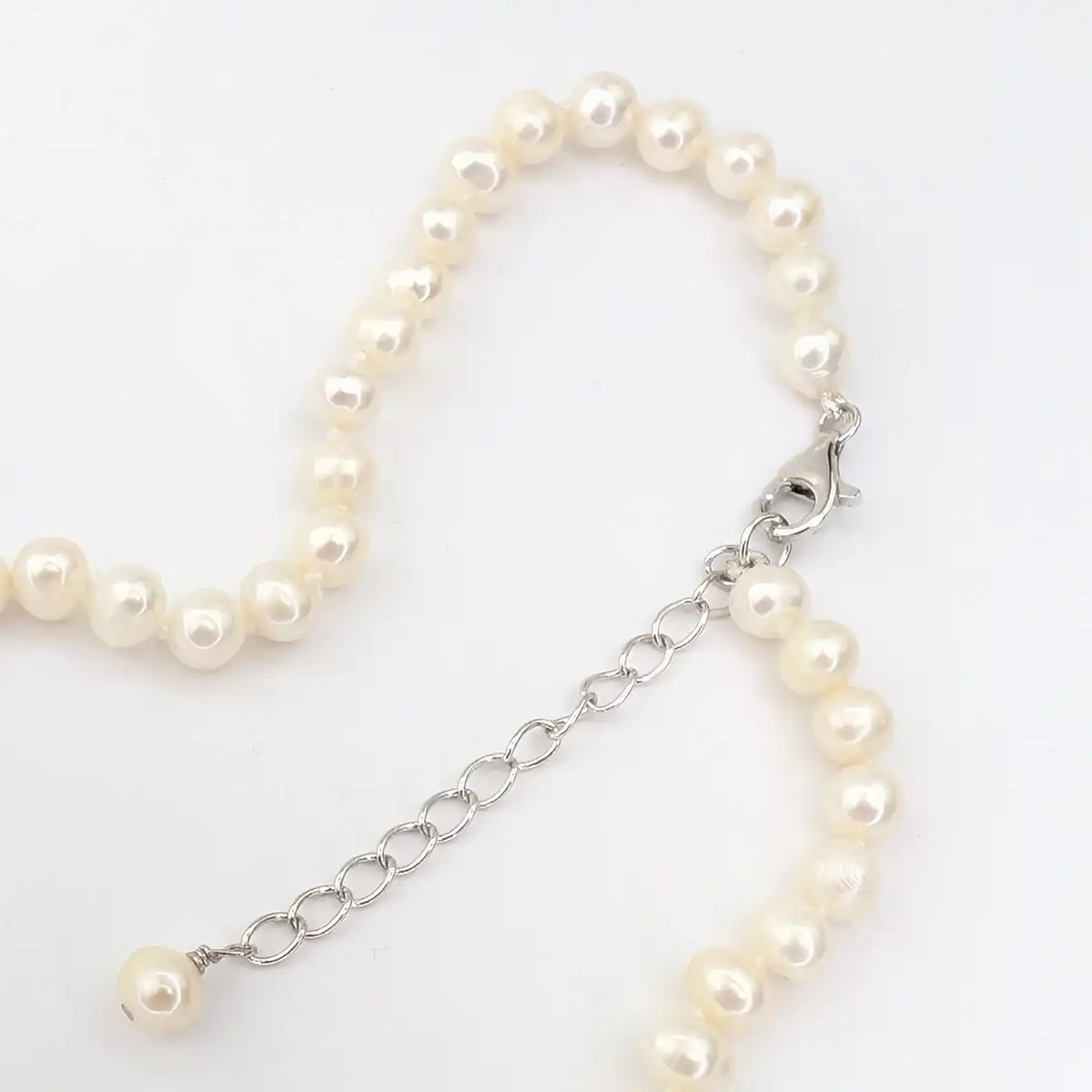 These great value pearl necklaces have been hand-crafted in our Wiltshire studios using high-lustre near-round freshwater pearls. The natural lustre of these lovely pearls cause the necklace to glisten as it moves, while the easy-to-use sterling silver lobster claw clasp makes it great for everyday wear. The necklace measures 16.5-inches (approx.) and for added versatility, a 2-inch silver extension chain means it can be lengthened to be worn over winter clothing or just for a different look. The pearls are a natural product and at this price point will show some marks and irregularities.