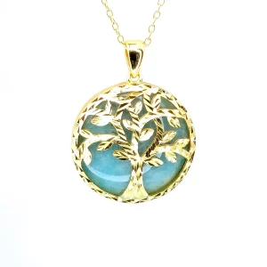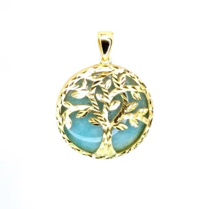 This gorgeous pendant (approx 20mm in diameter) features a beautifully crafted Tree-of-life motif in sterling silver coated in 9k gold plating. The tree is backed by a disc of textured Amazonite against which it really stands out. The Tree-of-Life symbolises the connections between heaven and earth and between all the diverse peoples of the world. The pendant comes with the option of an 18-inch gold plated sterling silver chain (please select with or without chain).Total weight (without chain) 5g (approx).