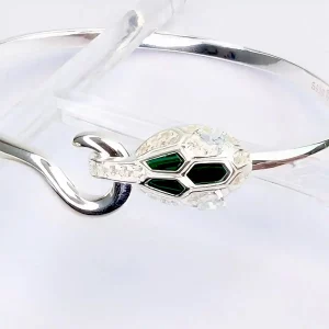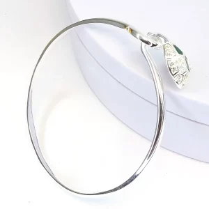 This striking Dragon’s Head bangle is hand-crafted from solid sterling silver and set with sparkling white topaz crystals, with slivers of green malachite forming the dragon’s head.